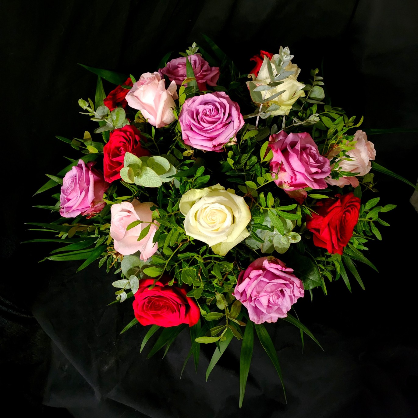 Centro de 15 rosas coloridas, ideal para aniversarios.