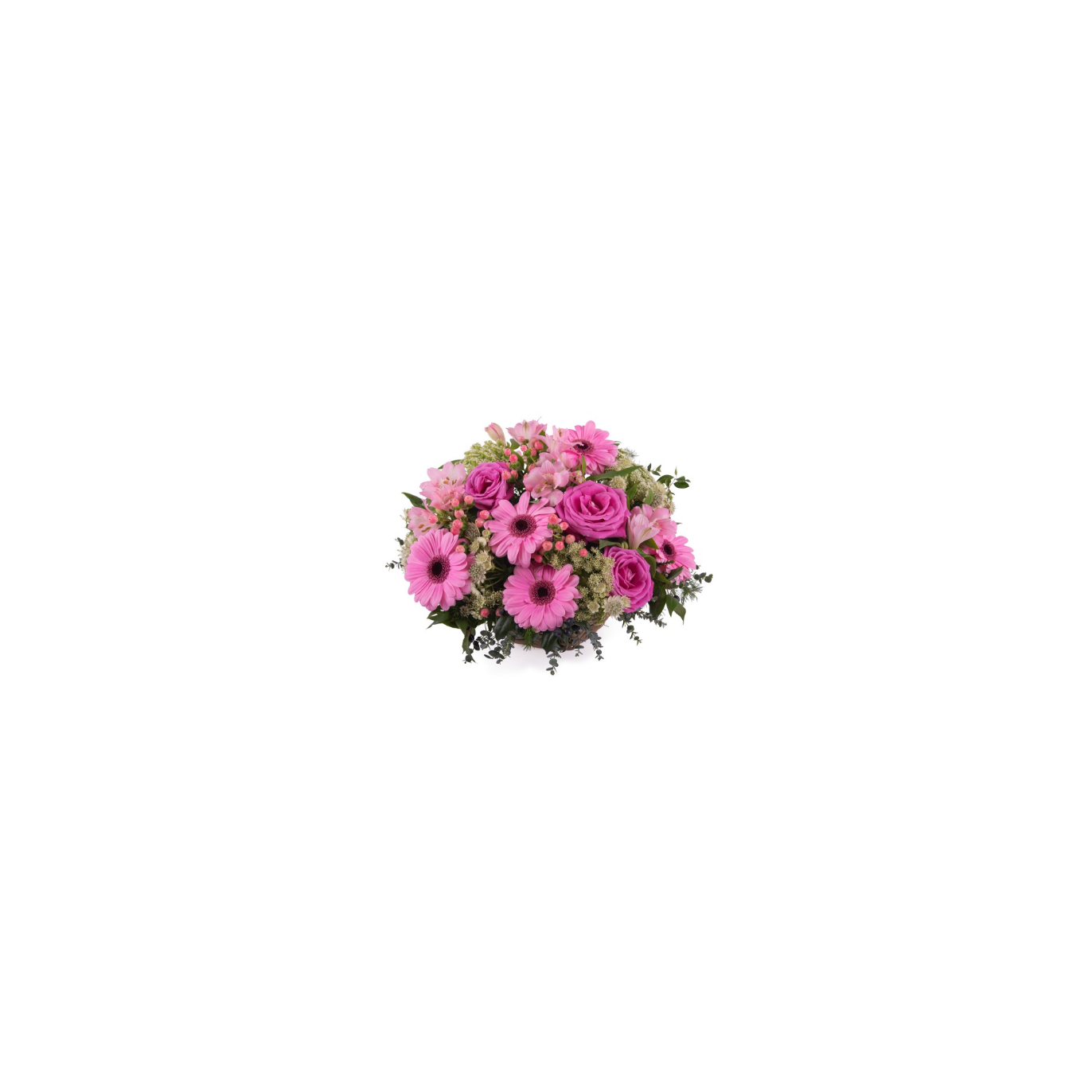 Centro en cesta de mimbre donde el rosa de las gerberas se fusiona con los verdes y tonos llenos de ternura.