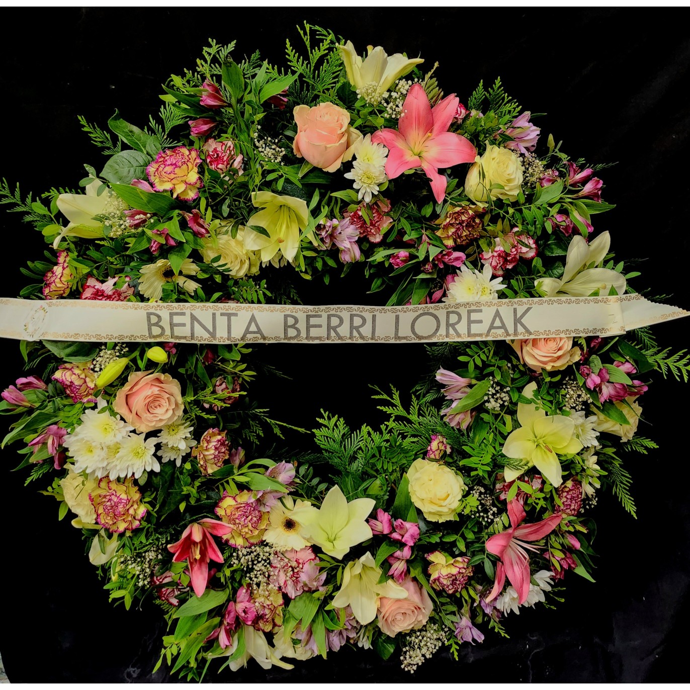 Corona de 60cm con flores en tono rosa y blanco con lilium, gerberas y rosas.
