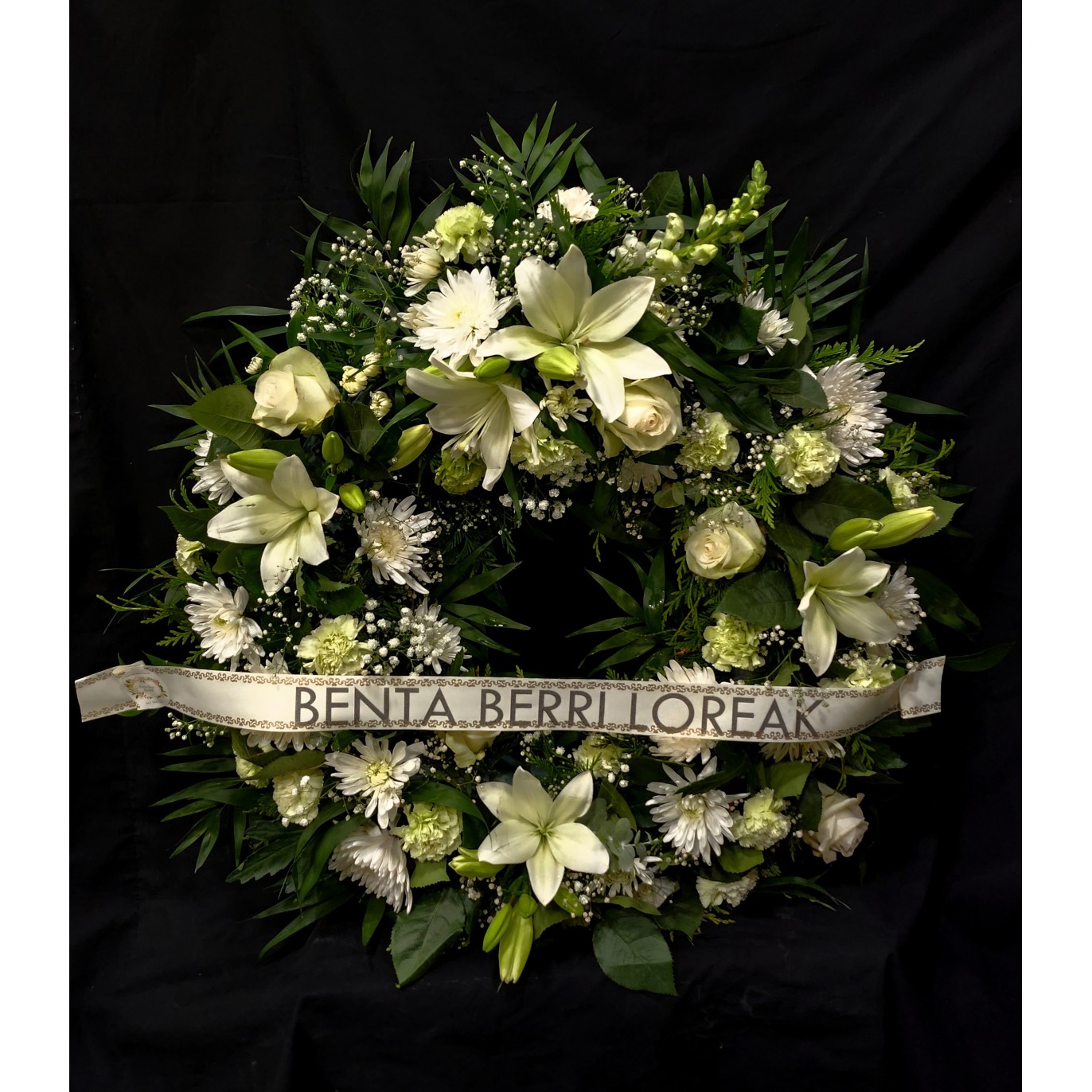 Corona de 60cm con flores variadas y blancas