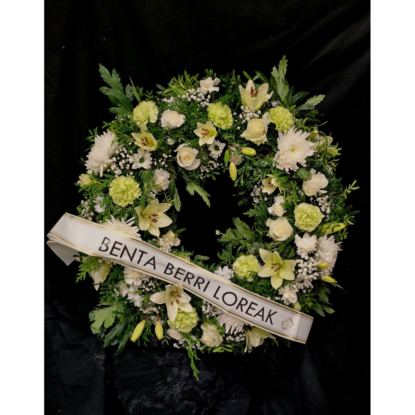Corona de 80cm grande con flores blancas y verdes.