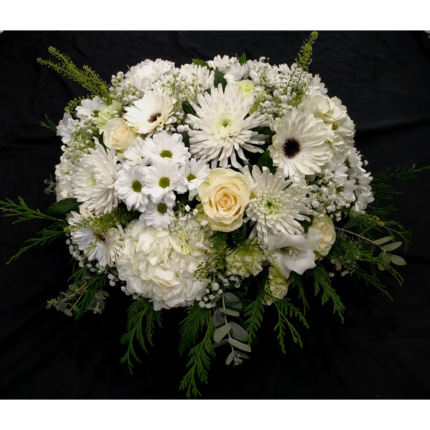Centro redondo blanco con flores de temporada y verdes variados.