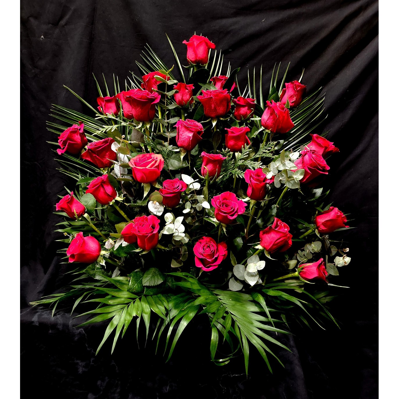 Centro estilizado con altura y hermosas rosas en tonos rojos, con verdes varios.