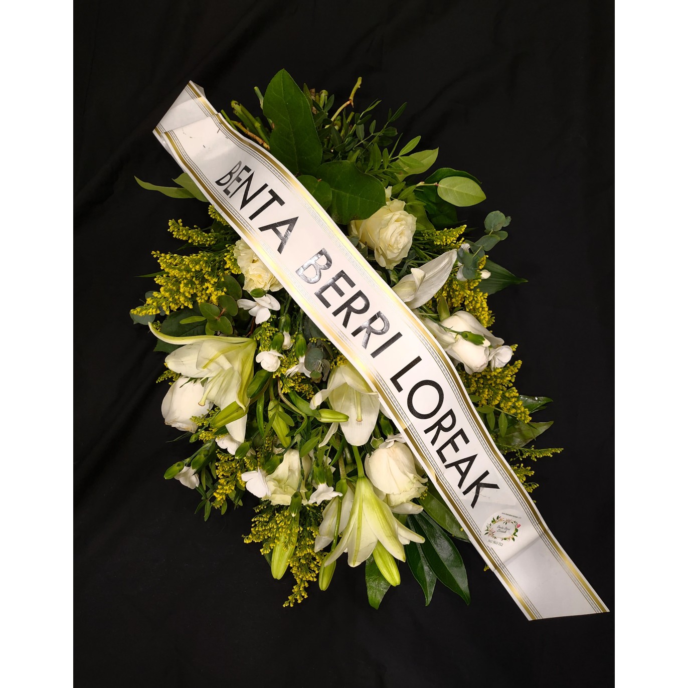 Ramo funerario de una cara, con lirios blancos, flores amarillas y verdes variados.