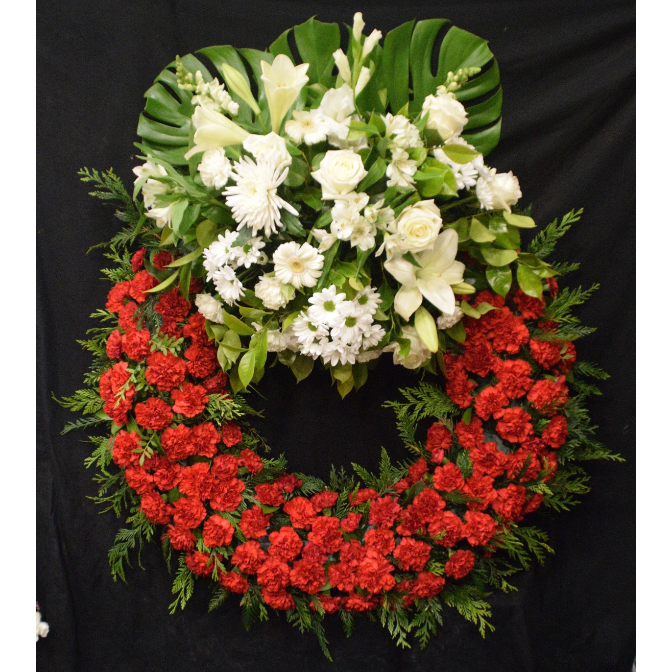 Corona de 80cm con clavel rojo y cabezal blanco.