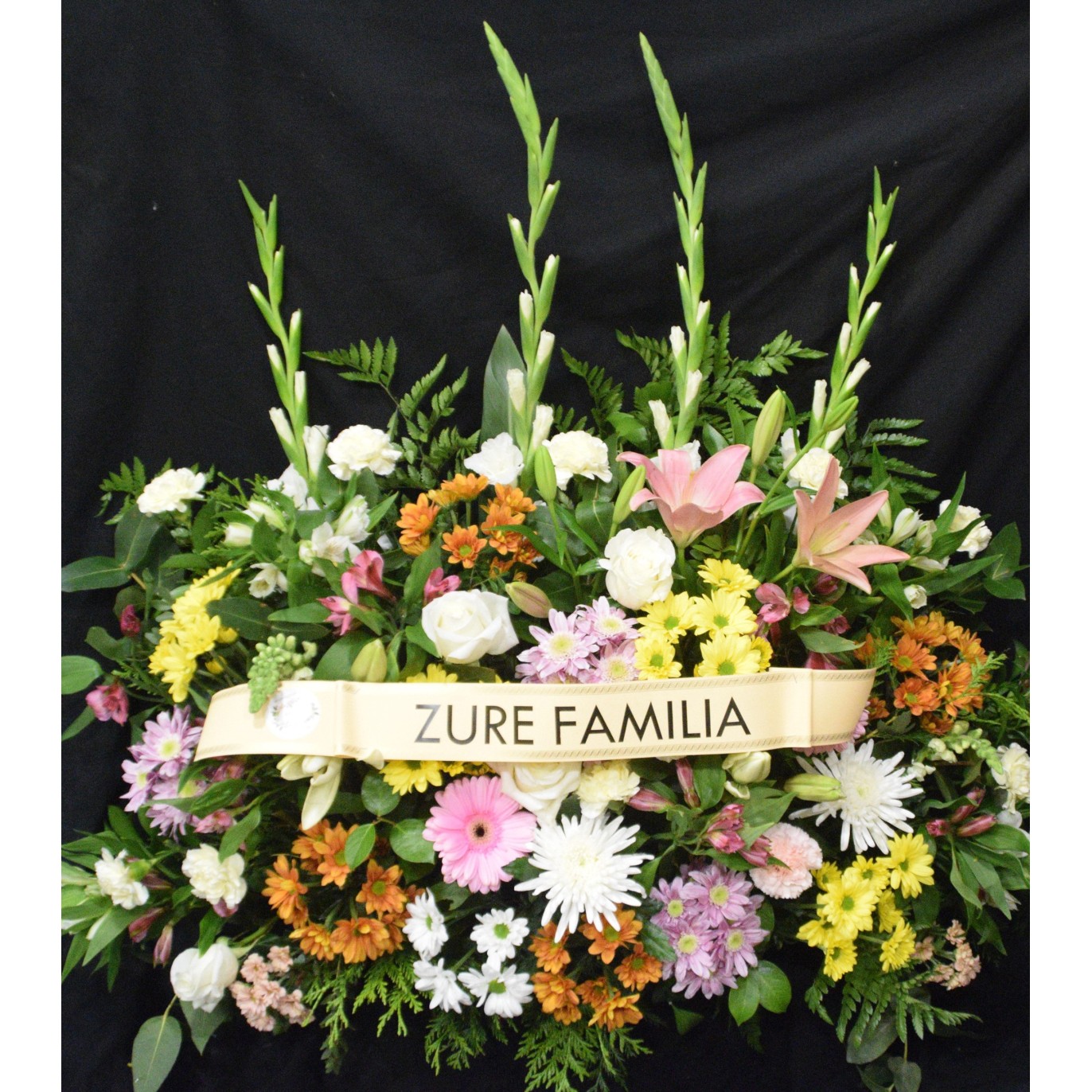 El arreglo incluye una cinta para sus mensajes de condolencias.