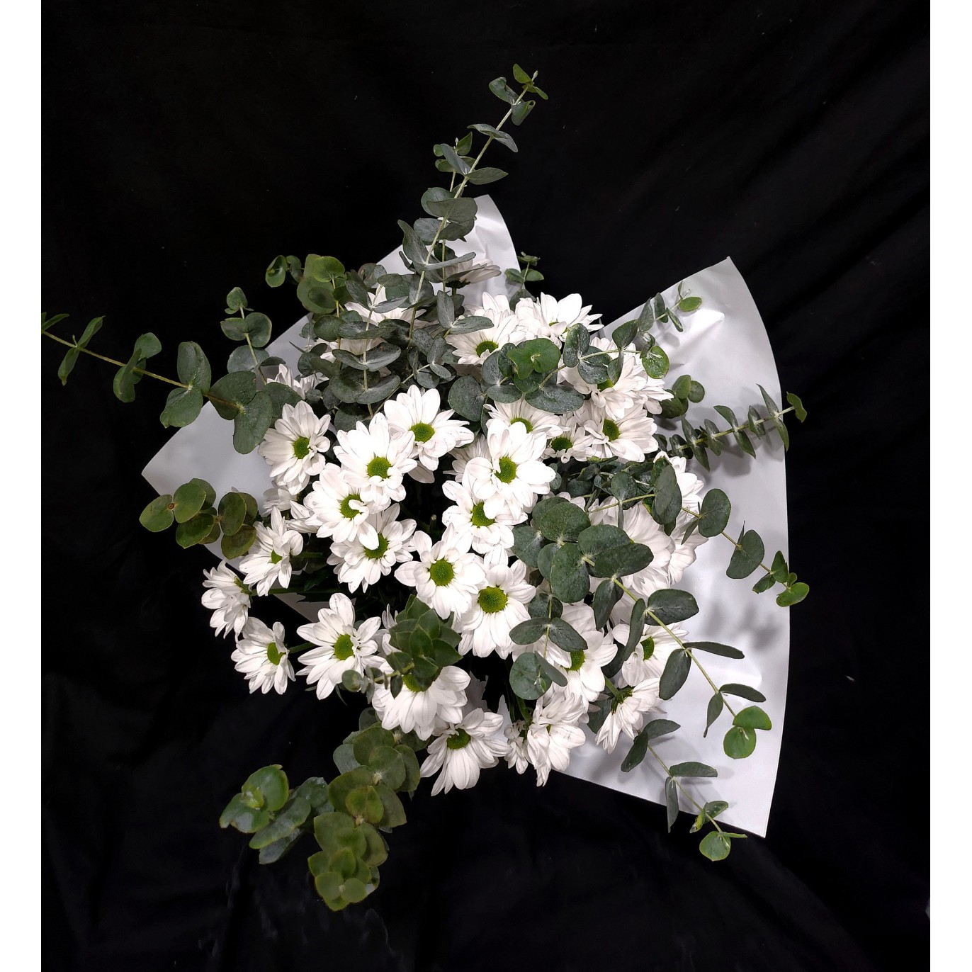 Ramo de margaritas blancas, eucalipto y verdes varios.
