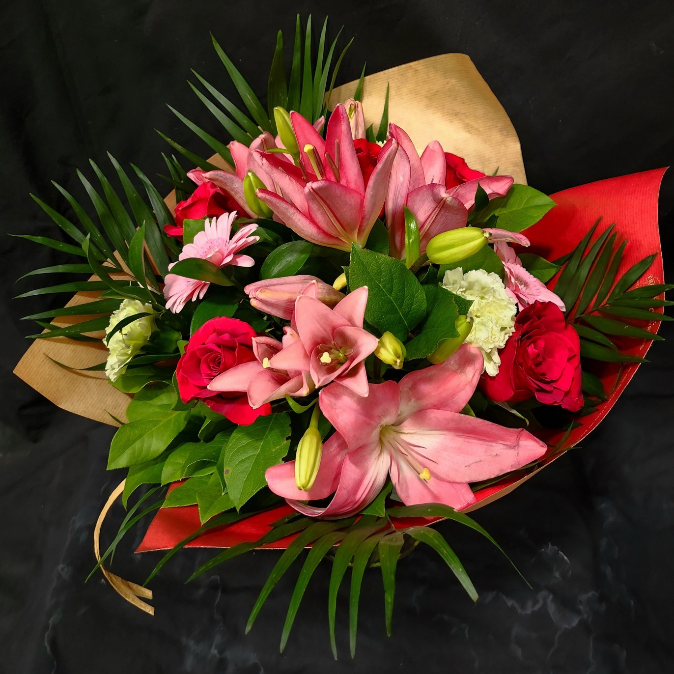 Ramo de rosas y lirios en tonos rojos y rosas.