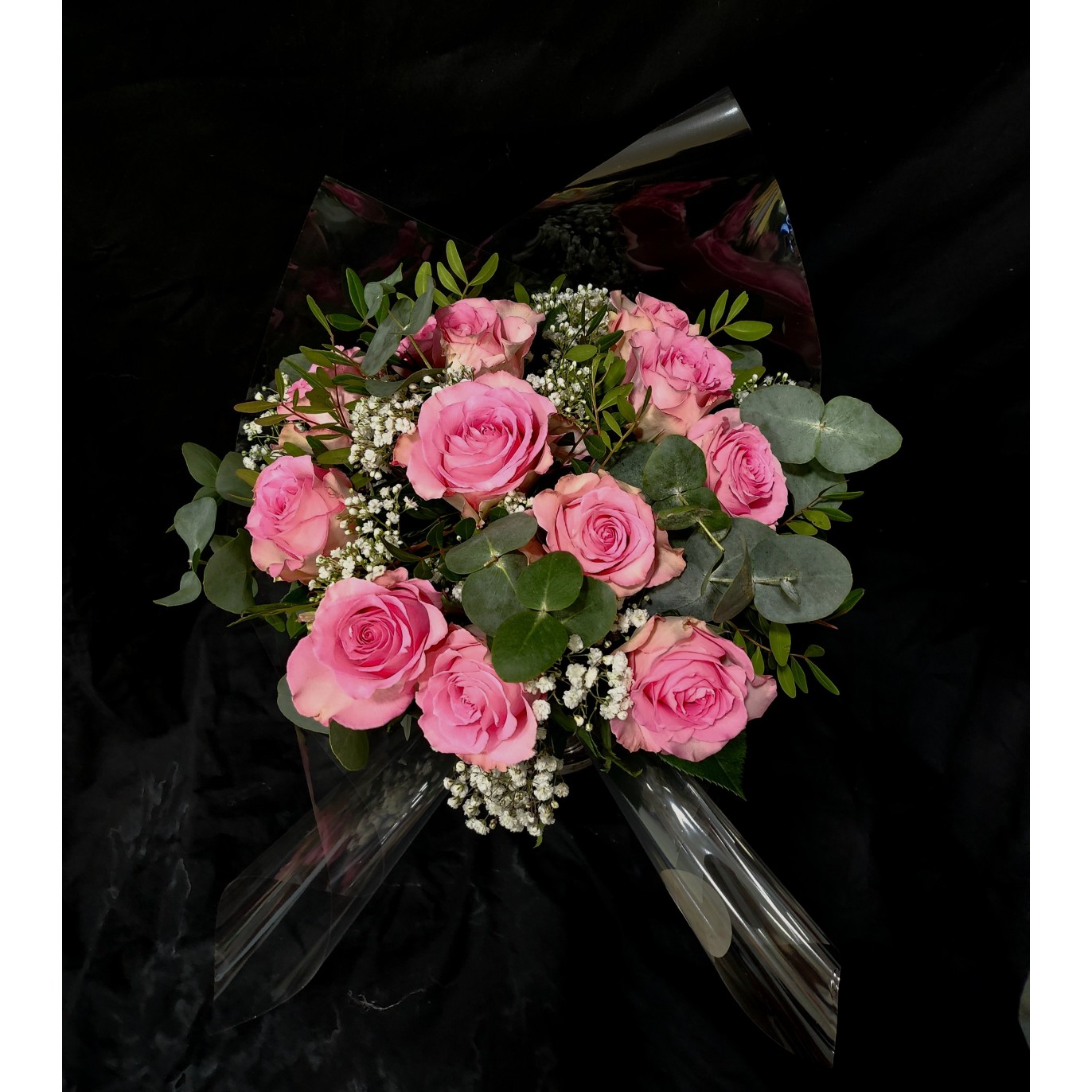 Ramo de 12 rosas rosa con paniculata y verdes variados.